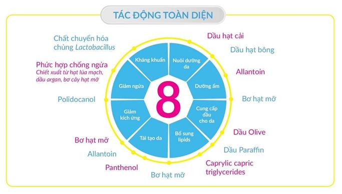 Chăm sóc da mặt và toàn thân, làm mềm da, giảm ngứa đặc biệt là vùng da khô, dị ứng và kích ứng