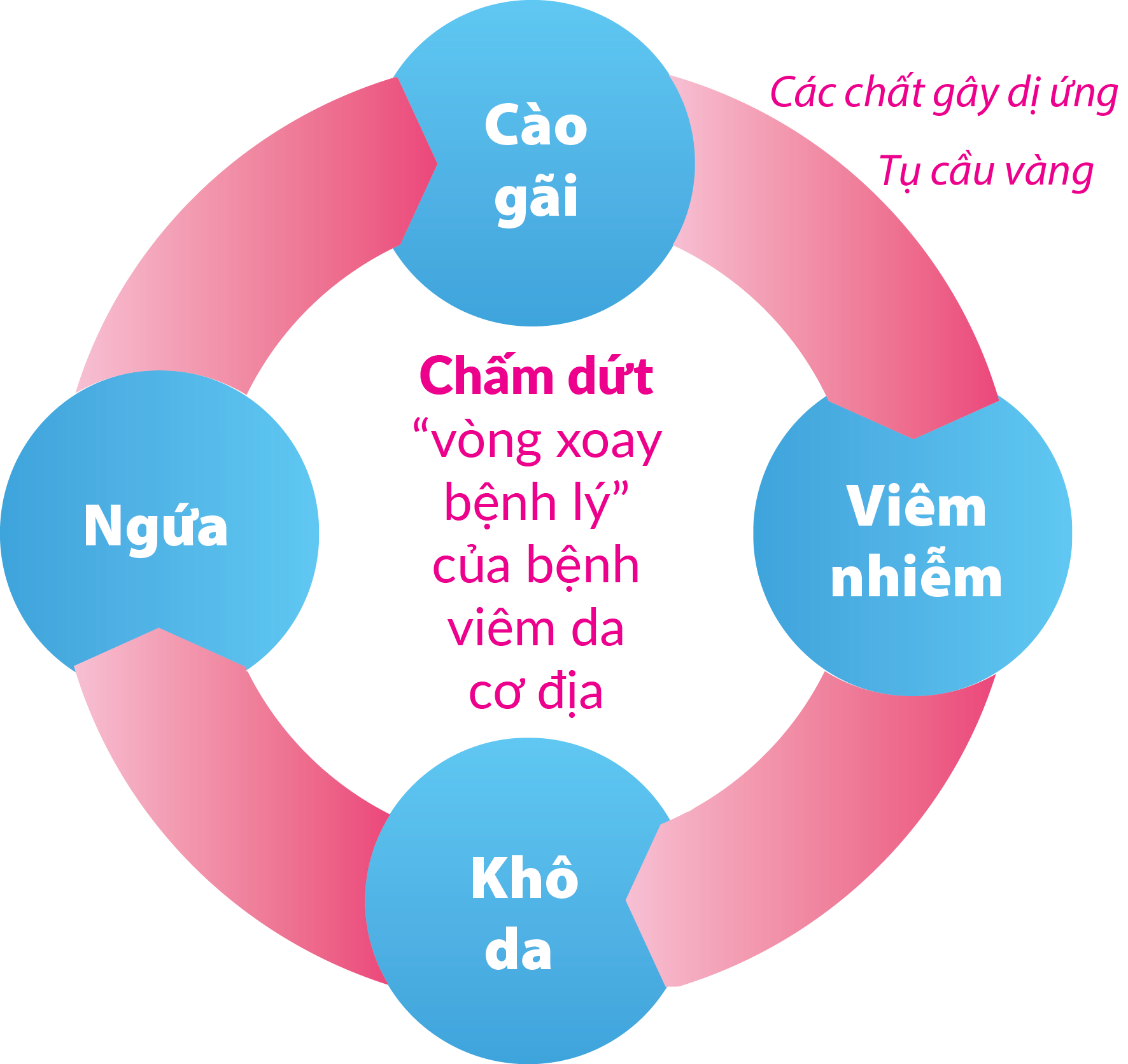 Da khô và ngứa kích thích bệnh nhân cào gãi, gây tổn thương lớp sừng của biểu bì da, tạo điều kiện cho sự xâm nhập của vi khuẩn tụ cầu vàng và các dị nguyên làm gia tăng hiện tượng viêm da. Kết quả là gây ra “vòng xoay bệnh lý” của bệnh viêm da cơ địa.